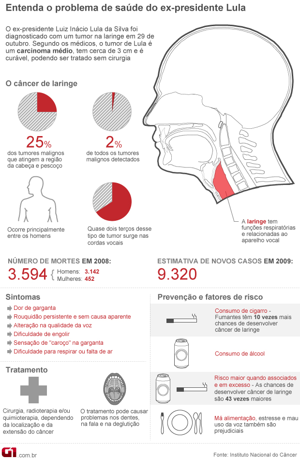 O câncer de laringe, que acomete o ex-presidente Luiz Inácio Lula da Silva, atinge cinco homens para cada mulher. A maioria (90%) dos pacientes fuma ou já fumou, e a bebida alcoólica ajuda a agravar ainda mais o quadro.