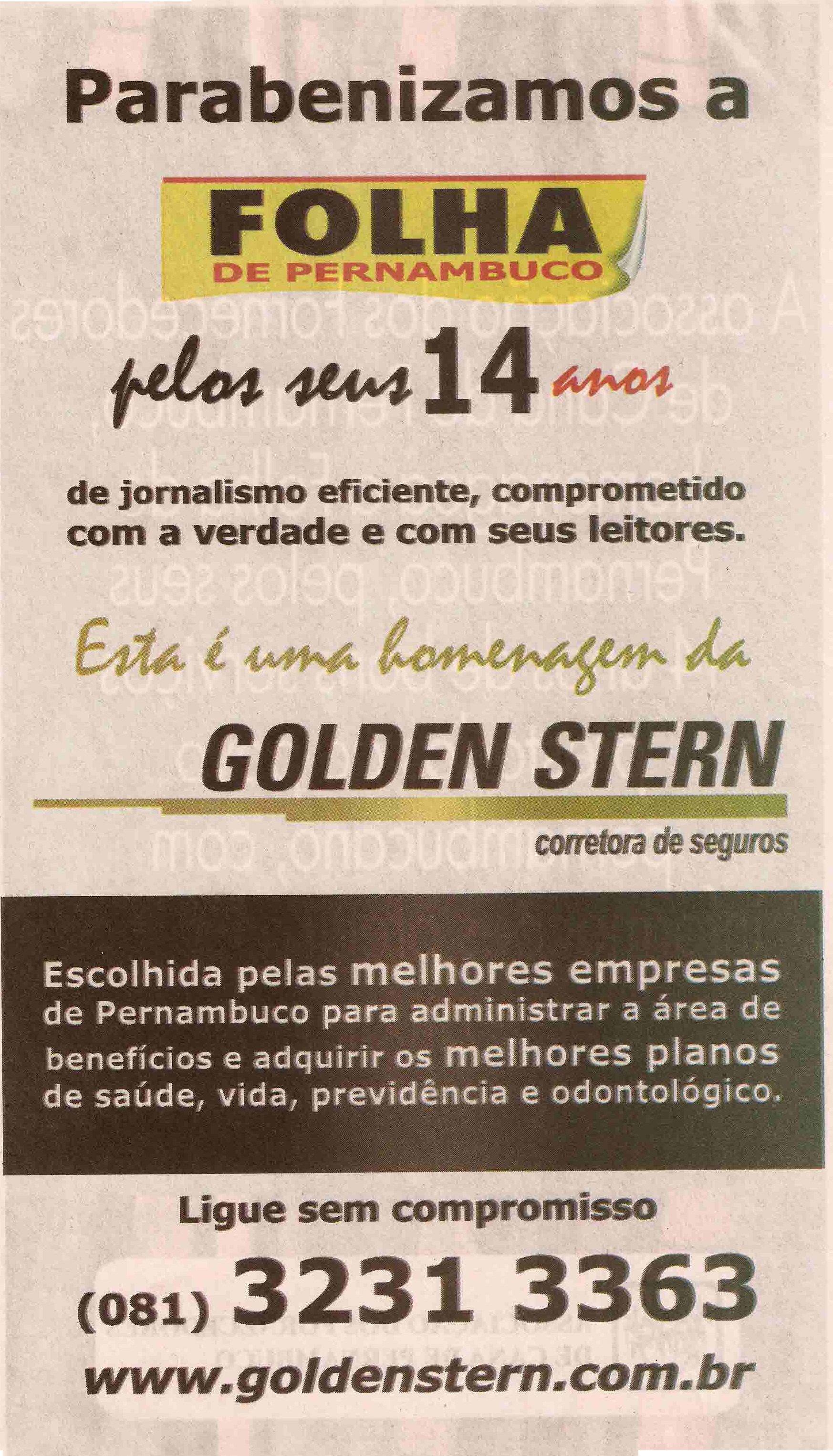 Em comemoração aos 14 anos de existência do Jornal Folha de Pernambuco, sendo um dos veículos de maior expressão no nordeste e um importante cliente, a Golden Stern o felicita em anuncio no Caderno Programa, do dia de hoje (03/04), página 9.