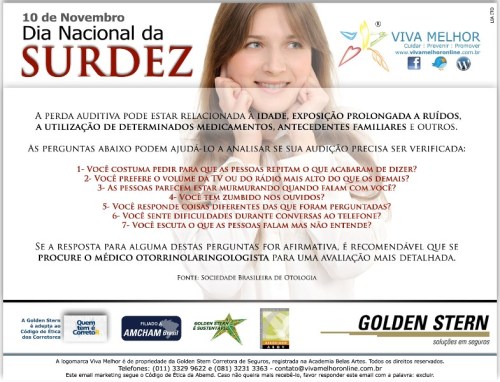 “Falar sobre deficiência auditiva nunca é fácil, por causa da resistência que as pessoas têm em admitir a surdez. Mas trazer à tona o problema é a melhor coisa a fazer. Estudos comprovam que o tratamento da perda auditiva, geralmente com o uso de aparelhos auditivos, resulta em melhoras significativas na qualidade de vida do idoso”, afirma a fonoaudióloga Marcella Vidal, da Telex Soluções Auditivas.