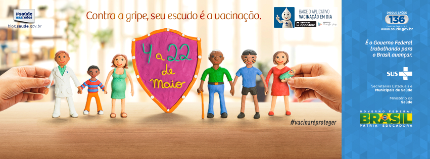CAMPANHA – A 17ª Campanha Nacional de Vacinação Contra a Gripe terá como Slogan “Contra a gripe, seu escudo é a vacinação” e reforça o conceito de proteção, além de explorar a imagem do escudo empunhado pelo Zé Gotinha, o personagem-símbolo da vacinação. Para a ação, que contará com filme para TV, spot para rádio, anúncio de revista, mobiliário exterior e peças para o ambiente online, o Ministério da Saúde investirá R$ 10 milhões.