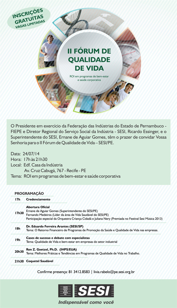 Published julho 15, 2014 Eventos , Promo Leave a CommentTags:bem-estar, Casa da Industria, Cruz Cabugá, Ernani de Aguiar Gomes, Evento, Fórum, FIEPE, Inscrições Gratuitas, Pernambuco, promoção, Qualidade, Qualidade de Vida, Recife, Ricardo Essinger, ROI, Saúde, Saúde Corporativa, Sesi