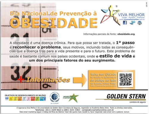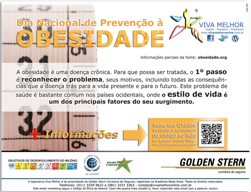 Published outubro 11, 2012 Campanhas Leave a CommentTags:alimentação, atividade física, bem-estar, Campanha, Dia Nacional de Prevenção à Obesidade, gordura, médico, noticia, nutrição, nutrição saudável, obesidade, Pesquisa, Prevenção, Qualidade de Vida, Saúde, sintomas, sobre peso, tratamento, vida, Viva Melhor